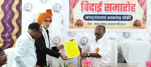 अंबागढ़ चौकी।नगर पंचायत में 41 साल तक निरंतर सेवा प्रदान करने के बाद सहायक राजस्व निरीक्षक दशरथ शर्मा शनिवार को शासकीय सेवा से सेवानिवृत्त हुए।शर्मा निकाय में दैनिक वेतन भोगी कर्मचारी के रूप में पद पर आए थे और नियमित कर्मचारी के रूप कार्य करते हुए अपने कार्य से कार्यमुक्त हुए। निकाय के अधिकारी कर्मचारियों ने उन्हें नगर पंचायत कार्यालय से विदाई दी। दशरथ शर्मा को स्मृति चिन्हए शाल श्रीफल प्रशस्ति पत्र भेंटकर सम्मानित किया गया। समारोह नगर पंचायत अध्यक्ष अनिल मानिकपुरी की अध्यक्षता में हुआ। सीएमओ विजय पांडेय उपयंत्री योगेश्वर ठाकुर तिलक यादव जलील रब्बानी सोफू जिलानी पटवारी लखनलाल सोरी दयाशंकर खंडेलवाल सोफू जिलानी रामसाय पटेल निजामसाय पीर खान रामकुमार देवांगन सिद्धार्थ देवांगन उपस्थित थे। कार्यक्रम का संचालन तिलक यादव ने किया।
