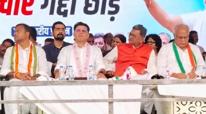 बिलासपुर। राहुल गांधी के आवाहन पर देशभर में “वोट चोर गद्दी छोड़” अभियान की शुरुआत की गई है। इसी कड़ी में, आज बिलासपुर के मुंगेली नाका चौक स्थित ग्रीन गार्डन में छत्तीसगढ़ प्रभारी सचिन पायलट के नेतृत्व में यह अभियान शुरू किया गया। इस मौके पर कांग्रेस के कई दिग्गज नेता और कार्यकर्ता शामिल हुए। मंच पर पूर्व मुख्यमंत्री भूपेश बघेल, पूर्व उपमुख्यमंत्री टी.एस. सिंहदेव, मंत्री सत्यनारायण शर्मा, ताम्रध्वज साहू और पीसीसी चीफ दीपक बैज ने अपने विचार रखे। पहले भूपेश बघेल ने कांग्रेस कार्यकर्ताओं और जनता को संबोधित किया, उसके बाद दीपक बैज और अंत में सचिन पायलट ने अपनी बात रखी।