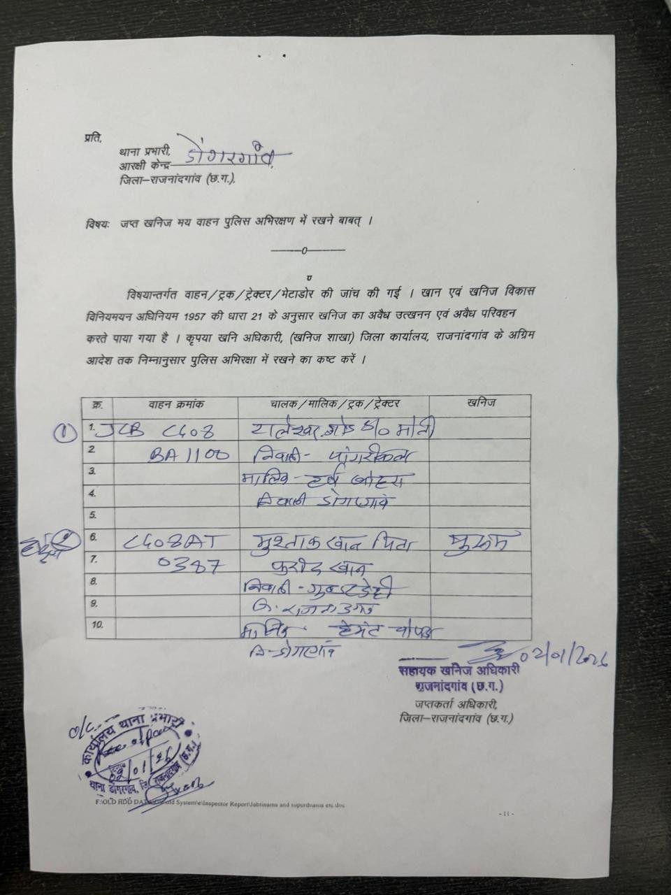 जप्त वाहनों में JCB क्रमांक Cg 08 BA 1100 और हाईवा क्रमांक CG 08 AT 0387 शामिल हैं। प्रशासनिक सूत्रों के मुताबिक, JCB मशीन के मालिक हर्ष बोहरा बताए जा रहे हैं, जिनका नाम कांग्रेस से जोड़ा जा रहा है। वहीं हाईवा CG 08 AT 0387 के मालिक हेमंत चोपड़ा, भाजपा के महामंत्री बताए जा रहे हैं। जबकि जे सी बी cg 08 BA 1100 को मुश्ताक खान पिता फरीद खान, निवासी निवाली (गुंडरदेही) चला रहा था।