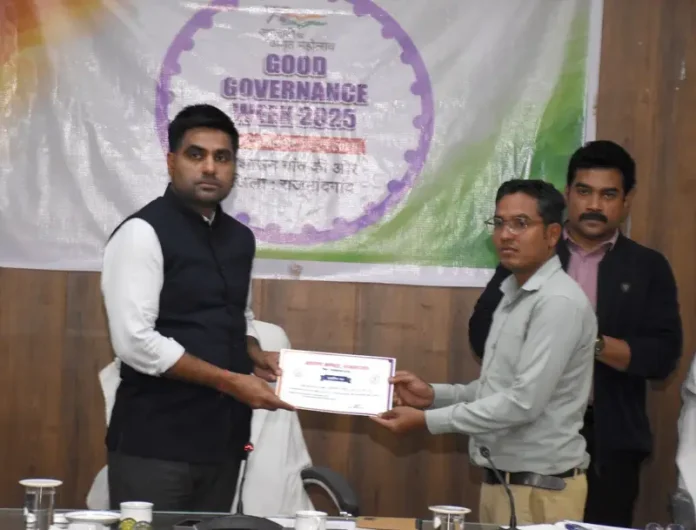 राजनांदगांव। कलेक्टर श्री जितेन्द्र यादव ने आज कलेक्टोरेट सभाकक्ष में धान खरीदी कार्य में उत्कृष्ट प्रदर्शन करने वाले ग्रामीण कृषि विस्तार अधिकारियों, पटवारियों, समिति प्रबंधकों एवं डाटा एण्ट्री ऑपरेटरों को प्रशस्ति पत्र प्रदान कर सम्मानित किया। कलेक्टर ने ग्रामीण कृषि विस्तार अधिकारी छुरिया सुश्री दीक्षा नंदेश्वर, ग्रामीण कृषि विस्तार अधिकारी सीतागोटा श्री डिम्पल खापर्डे, ग्रामीण कृषि विस्तार अधिकारी कोकपुर श्री शैलेश साहू, पटवारी छुरिया श्री प्रशांत सिंह ठाकुर, पटवारी श्री घोघरे श्री आशीष साहू, पटवारी बम्हनी चारभाटा श्री सोनम कोकिला,पटवारी घुपसाल श्री डेविड भूआर्य, पटवारी श्री राहुल कसेट, पटवारी श्री हुकुम चंद महिलांग, समिति प्रबंधक जोब श्री धनसिंग, समिति प्रबंधक गहिराभेड़ी श्री बसंत, समिति प्रबंधक कुमर्दा श्री मनकलाल साहू, डाटा एण्ट्री ऑपरेटर धान उपार्जन केन्द्र बोरतालाव श्री भागचंद साहू, डाटा एण्ट्री ऑपरेटर धान उपार्जन केन्द्र गहिराभेंडी श्री रिमन्त कुमार साहू, डाटा एण्ट्री ऑपरेटर धान उपार्जन केन्द्र जोब श्री विनोद साहू को प्रशस्ति पत्र प्रदान कर सम्मानित किया।