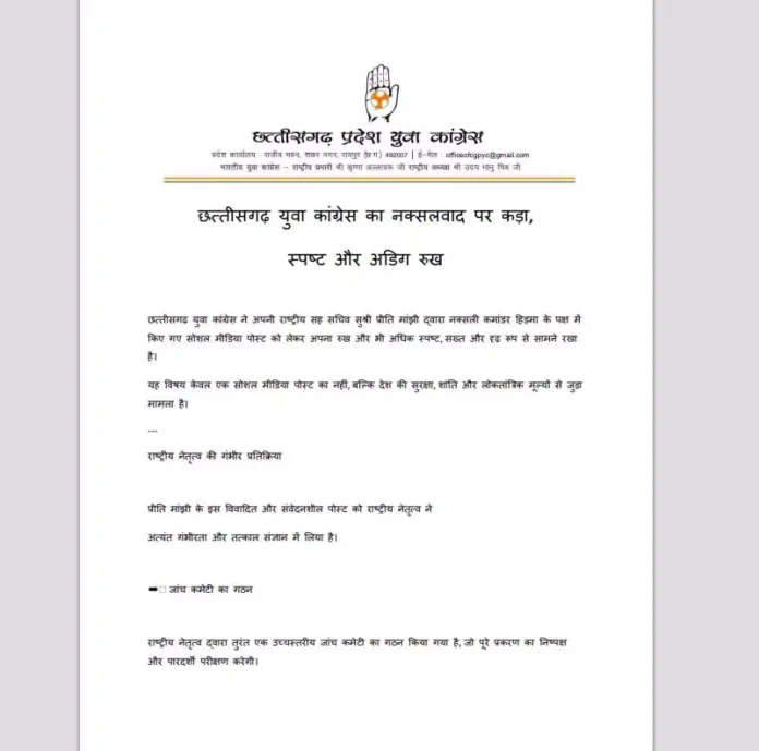 रायपुर। युवा कांग्रेस की राष्ट्रीय सह सचिव प्रीति मांझी के विवादित पोस्ट पर संगठन ने कड़ा कदम उठाते हुए जांच के लिए उच्च स्तरीय कमेटी गठित की है. इसके साथ जांच के पूर्ण होने तक बतौर पदाधिकारी उसके काम पर रोक लगाई है. दरअसल, प्रीति मांझी ने पिछले दिनों एनकाउंटर में मारे गए कुख्यात नक्सली कमांडर माडवी हिडमा को ‘लाल सलाम कामरेड हिडमा’ लिखते हुए श्रद्धांजलि दी थी. सोशल मीडिया में पोस्ट के वायरल होने के बाद छत्तीसगढ़ भाजपा ने फेसबुक में कांग्रेस पर अर्बन नक्सल तैयार करने के गंभीर आरोप लगाए हैं. बात बिगड़ती देख प्रीति मांझी ने अपनी सफाई देते हुए कहा था कि उनकी बात का गलत मतलब निकाला जा रहा है. मैं गाँधीवादी विचारधारा की हूं, और किसी भी सूरत में हिंसा का समर्थन नही करती हूं. लेकिन उनकी सफाई युवा कांग्रेस को रास नहीं आई है. छत्तीसगढ़ युवा कांग्रेस प्रभारी ने अमित सिंह पठानिया ने बताया कि मामले की जांच के लिए राष्ट्रीय नेतृत्व ने उच्चस्तरीय कमेटी का गठन कर दिया गया है. इसके साथ जांच पूरी होने तक प्रीति मांझी के राष्ट्रीय सह सचिव के पद पर कार्य करने पर अस्थाई रोक लगा दी है।