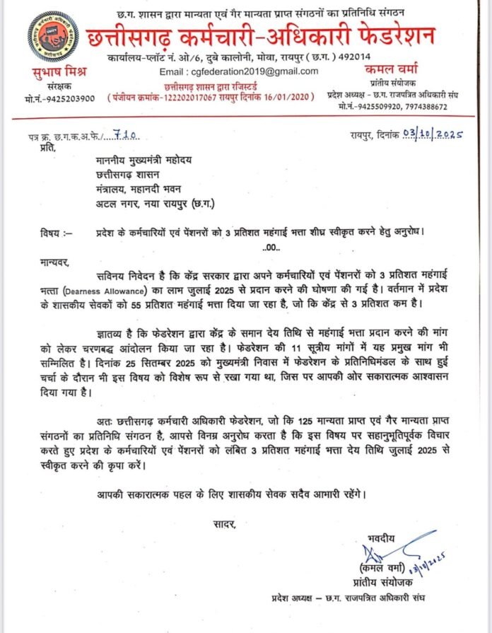 छत्तीसगढ़ कर्मचारी-अधिकारी संघ ने सीएम साय को लिखा पत्र, 3% महंगाई भत्ता देने की मांग