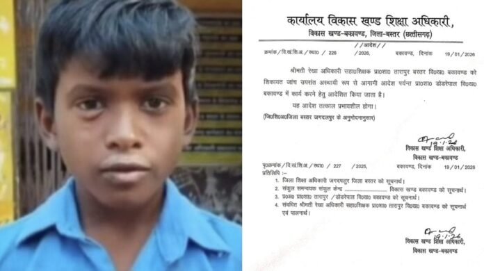 बस्तर। बस्तर जिले के बकावंड विकासखंड के प्राथमिक विद्यालय तारापुर में विगत दिनों एक शिक्षिका के द्वारा एक छात्र की पिटाई का मामला सामने आया था। इस घटना के बाद छात्र स्कूल जाने से डर रहा था, जिससे छात्र के परिजनों में गहरा रोष व्याप्त था। इस वजह से आरोपी शिक्षिका रेखा अधिकारी को तत्काल प्रभाव से हटाने की मांग कर रहे थे।