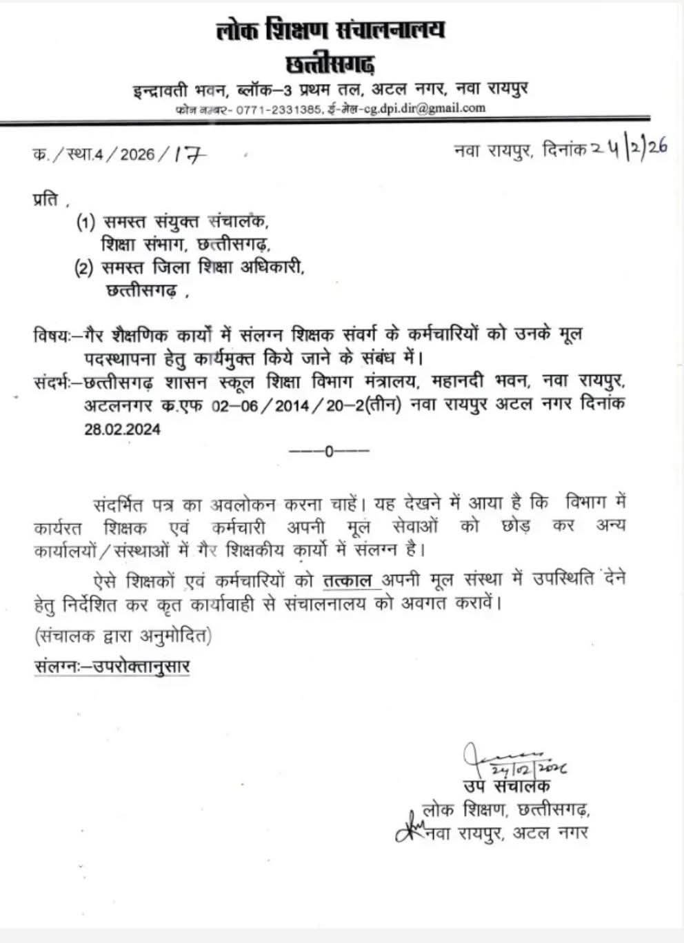 Homeछत्तीसगढ़ डीपीआई द्वारा गैर शिक्षकीय कार्य में संलग्न शिक्षकों का संलग्नीकरण समाप्त कर मूल शाला में उपस्थित होने आदेश जारी By AG Khabar February 26, 2026 छत्तीसगढ़जॉब-एजुकेशनरायपुर डीपीआई द्वारा गैर शिक्षकीय कार्य में संलग्न शिक्षकों का संलग्नीकरण समाप्त कर मूल शाला में उपस्थित होने आदेश जारी February 26, 2026 कलेक्टर ऑफिस में नौकरी दिलाने के नाम पर 11 लाख की ठगी, राजनीतिक संरक्षण के आरोप, जांच के घेरे में रसूखदार चेहरे February 26, 2026 होली से पहले नगरीय निकायों को मिली बड़ी वित्तीय राहत: कर्मचारियों के वेतन के लिए चुंगी क्षतिपूर्ति मद से 51.71 करोड़ रुपये किए गए... February 26, 2026 कलेक्टर ने जनदर्शन में गंभीरता से सुनी नागरिकों की समस्याएं February 26, 2026 कभी नहीं लौटूंगा मां, कॉल कट कर युवक ने नदी में किया सुसाइड February 26, 2026 DPI का एक और आदेश जारी हुआ है जिसमें गैर शिक्षकीय कार्य में संलग्न शिक्षकों का संलग्नीकरण समाप्त कर मूल शाला में उपस्थित होने आदेशित किया गया है। Share FacebookTwitterPinterestWhatsApp Join Whatsapp Group Follow on Facebook Subcribe Youtube Previous articleकलेक्टर ऑफिस में नौकरी दिलाने के नाम पर 11 लाख की ठगी, राजनीतिक संरक्षण के आरोप, जांच के घेरे में रसूखदार चेहरे Hot Topics कलेक्टर ऑफिस में नौकरी दिलाने के नाम पर 11 लाख की ठगी, राजनीतिक संरक्षण के आरोप, जांच के घेरे में रसूखदार चेहरे होली से पहले नगरीय निकायों को मिली बड़ी वित्तीय राहत: कर्मचारियों के वेतन के लिए चुंगी क्षतिपूर्ति मद से 51.71 करोड़ रुपये किए गए... कलेक्टर ने जनदर्शन में गंभीरता से सुनी नागरिकों की समस्याएं Load more Related Articles AG Khabar - February 26, 2026कलेक्टर ऑफिस में नौकरी दिलाने के नाम पर 11 लाख की ठगी, राजनीतिक संरक्षण के आरोप, जांच के घेरे में रसूखदार चेहरे AG Khabar - February 26, 2026होली से पहले नगरीय निकायों को मिली बड़ी वित्तीय राहत: कर्मचारियों के वेतन के लिए चुंगी क्षतिपूर्ति मद से 51.71 करोड़ रुपये किए गए... AG Khabar - February 26, 2026कलेक्टर ने जनदर्शन में गंभीरता से सुनी नागरिकों की समस्याएं Load more