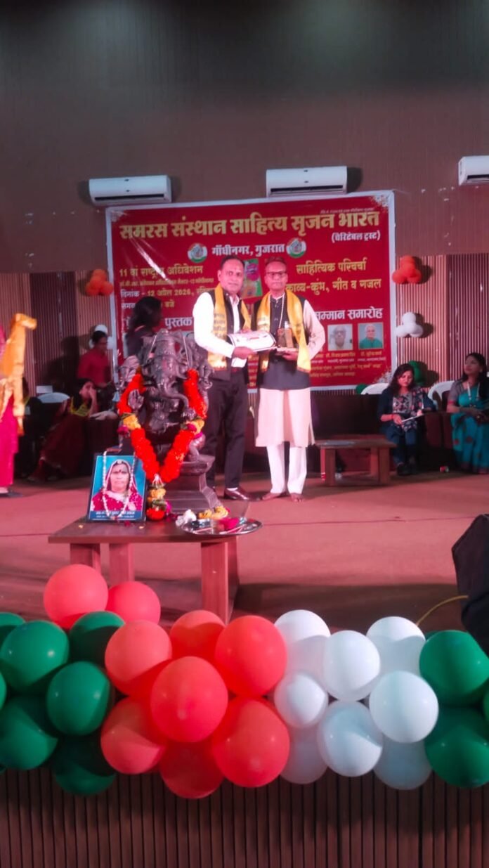 डोंगरगाँव(घनश्याम साव ) ।डोंगरगाँव नगर के अंतर्राष्ट्रीय ख्याति प्राप्त साहित्यकार, मंच संचालक, छंद गुरु,रंगकर्मी,शिक्षा विद डाॅ.गजेन्द्र हरिहारनो”दीप ” को गांधीनगर गुजरात में 12 अप्रैल को समरथ संस्थान साहित्य सृजन भारत के 11 वें राष्ट्रीय अधिवेशन में प्रेम पुष्प समरस शिरोमणि सम्मान-2026 सम्मान से सम्मानित किया गया। इस अधिवेशन में भारत देश के 18 राज्यों से लगभग 150 साहित्यकार सम्मिलित हुए। उनको इस सम्मान के लिए देश-विदेश के सभी साहित्य कारों , परिजनों व इष्टमित्रों ने बधाई प्रेषित किया है।डाॅ.गजेन्द्र हरिहारनो”दीप ” के साथ अखिलेश्वर मिश्रा ‘अकाट्य’ पिनकापार बालोद, हर्षा देवांगन’ हर्षराज’ डौंडी लोहारा,गायत्री साहू ‘शिवांगी ‘ बालोद, डाॅ माधवी गणवीर व रोहिणी पटेल डोंगरगाँव, ममता यादव रायपुर भी इस राष्ट्रीय अधिवेशन में सम्मिलित हुए।