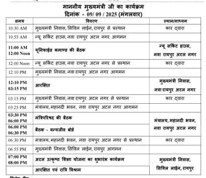 रायपुर। सीएम साय आज विभिन्न बैठकों में शामिल होंगे. निर्धारित कार्यक्रम के मुताबिक, मुख्यमंत्री सुबह 11 बजे यूनीफाइड कमांड की बैठक लेंगे. दोपहर 3:30 बजे मंत्री परिषद के बैठक की मुख्यमंत्री अध्यक्षता करेंगे. इसके बाद वन्यजीव बोर्ड के लिए शाम 6 बजे विशेष बैठक में शामिल होंगे. शाम 7 बजे अटल उत्कृष्ठ शिक्षा योजना का शुभारंभ करेंगे. यह भी पढ़े मुख्यमंत्री विष्णुदेव साय की अध्यक्षता में मंगलवार 9 सितंबर 2025 को दोपहर 3ः30 बजे मंत्रालय (महानदी भवन) अटल नगर, नवा रायपुर में राज्य मंत्रीपरिषद (कैबिनेट) की बैठक आयोजित होगी। मंत्रिमंडल विस्तार के बाद साय कैबिनेट की यह पहली बैठक होगी, जिसमें सभी 14 मंत्री शामिल होंगे। इससे पहले पिछली बैठक 19 अगस्त को हुई थी। इस बैठक में कई अहम मुद्दों पर चर्चा हो सकती है।