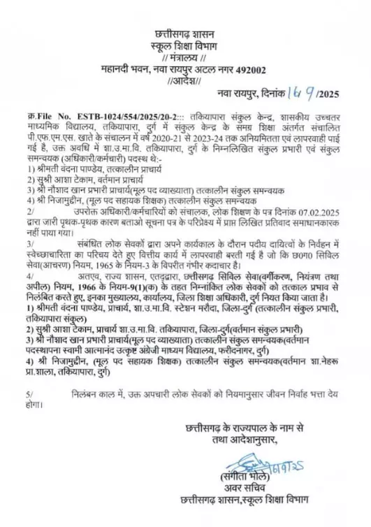 भिलाई। दुर्ग जिला शिक्षा विभाग में भ्रष्टाचार एक मामले में एक साथ 3 प्राचार्य और एक शिक्षक को निलंबित किया गया है। जिसकी शिकायत मार्च 2024 में प्रनाम के अध्यक्ष पवन केसवानी ने दुर्ग जिला शिक्षा अधिकारी और कलेक्टर से फरीदनगर के प्रभारी प्राचार्य नौशाद खान समेत शिक्षक निजामुद्दीन के विरुद्ध की थी। शिकायत में बताया गया कि फरीदनगर के प्रभारी प्राचार्य नौशाद खान ने दुर्ग के तकियापारा के प्रभारी रहते हुए संकुल केंद्र के अकाउंट को हैंडओवर न करते हुए दो-दो फर्जी अकाउंट संचालित कर लाखों रुपए का गबन किया है। उनके साथ निजामुद्दीन भी इस अकाउंट संचालन में शामिल था।  शिकायत के बाद हुई जांच में पाया गया कि नौशाद खान और निजामुद्दीन ने मिलकर करीब 1,84,000 रुपए का गबन किया है। उसी जांच में यह भी सामने आया कि बाद में तकियापारा में पदस्थ हुईं दो महिला प्राचार्य वंदना पांडे व आशा टेकाम ने इस गड़बड़ी की जानकारी होने के बाद भी आपत्ति नहीं प्रकट की, जिससे उन्हें भी भ्रष्टाचार में शामिल माना गया और निलंबित किया गया।यह मामला छत्तीसगढ़ में शिक्षा विभाग के इतिहास में पहली बार है, जिसमें एक ही शिकायत पर चार लोगों को एक साथ निलंबित किया गया।  यह निलंबन कार्रवाई भ्रष्टाचार के खिलाफ शिक्षा विभाग की कठोर कार्रवाई का प्रतीक है और यह संदेश देती है कि विभाग में ईमानदारी और पारदर्शिता स्थापित करने के लिए किसी भी स्तर पर गलत कार्य स्वीकार्य नहीं होगा।पवन केसवानी द्वारा 4 मार्च 2024 को जिला शिक्षा अधिकारी और 8 मार्च 2024 को कलेक्टर को दी गई शिकायत के डेढ़ साल बाद यह निलंबन हुआ है, जिससे साफ होता है कि इस प्रकार की गंभीर शिकायतों पर सरकार और प्रशासन कार्रवाई करने के लिए गंभीर हैं।यह कार्रवाई न सिर्फ भ्रष्टाचार को खत्म करने की दिशा में एक महत्वपूर्ण कदम है, बल्कि इमानदार शिक्षकों और अधिकारियों के लिए भी एक संदेश है कि वे पूरी निष्ठा और पारदर्शिता के साथ अपने कर्तव्यों का पालन करें।इस प्रकार, यह मामला शिक्षा विभाग में जवाबदेही और भ्रष्टाचार निर्मूलन की दिशा में एक मिसाल बन गया है।