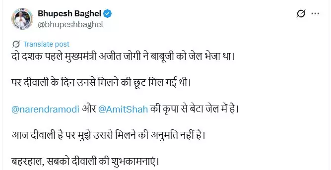रायपुर। दिवाली पर चैतन्य बघेल से मिलने आज भूपेश बघेल को अनुमति नहीं मिली। पूर्व सीएम बघेल ने X पोस्ट में बताया, दो दशक पहले मुख्यमंत्री अजीत जोगी ने बाबूजी को जेल भेजा था। पर दीवाली के दिन उनसे मिलने की छूट मिल गई थी। पीएम मोदी और अमित शाह की कृपा से बेटा जेल में है। आज दीवाली है पर मुझे उससे मिलने की अनुमति नहीं है। बहरहाल, सबको दीवाली की शुभकामनाएं। यह भी पढ़े पूर्व सीएम भूपेश बघेल के बेटे चैतन्य बघेल ने प्रवर्तन निदेशालय (ED) की कार्रवाई और अपनी गिरफ्तारी को असंवैधानिक बताते हुए हाईकोर्ट में याचिका दायर की थी। उस याचिका को हाईकोर्ट की सिंगल बेंच ने खारिज कर दिया है। शराब घोटाले के मनी लॉन्ड्रिंग मामले में आज सुनवाई हुई। दरअसल, चैतन्य बघेल ने ईडी की ओर से की गई जांच, गिरफ्तारी को नियम विरुद्ध और असंवैधानिक बताते हुए रद्द करने की मांग की थी। इस मामले में जस्टिस अरविंद कुमार वर्मा की सिंगल बेंच ने दोनों पक्षों की दलीलें सुनने के बाद 24 सितंबर को फैसला सुरक्षित रखा था, जिसे अब सुनाया गया है। कोर्ट ने कहा कि, जांच और गिरफ्तारी पर हस्तक्षेप करने का कोई उचित आधार नहीं है। कोर्ट ने माना कि ईडी की कार्रवाई कानून के तहत की गई है। इसलिए इसमें न्यायालय को हस्तक्षेप करने की आवश्यकता नहीं है। इस मामले में ईडी की ओर से एडवोकेट सौरभ पांडेय ने पैरवी की।