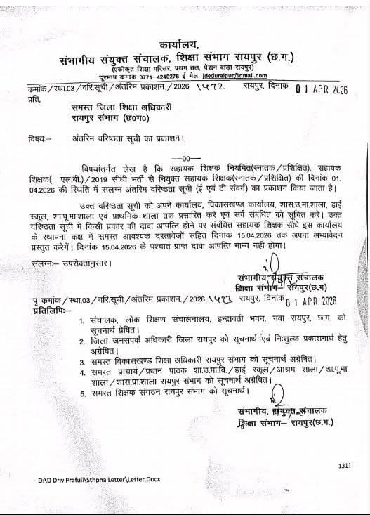 Homeछत्तीसगढ़ दुर्ग संभाग अंतर्गत सहायक शिक्षकों की अंतिम वरिष्ठता सूची प्रकाशित By AG Khabar April 1, 2026 छत्तीसगढ़जॉब-एजुकेशन श्री राम नवमी उत्सव समिति के द्वारा मर्यादा पुरुषोत्तम भगवान श्री राम की जन्मोत्सव दल्लीराजहरा में धूमधाम से मनाया गया April 1, 2026 दुर्ग संभाग अंतर्गत सहायक शिक्षकों की अंतिम वरिष्ठता सूची प्रकाशित April 1, 2026 गृह मंत्री विजय शर्मा ने नक्सलवाद के खात्मे पर भरी हुंकार, कहा- संकल्प लेने के साहस से 2 वर्ष में खत्म हुई 5 दशक... April 1, 2026 बस्तर के पांच जिलों में 35 माओवादियों का समर्पण, 11 करोड़ का सोना बरामद April 1, 2026 एक दूल्हा-दो दुल्हनों की शादी मामले में बवाल, आदिवासी समाज में आक्रोश, कड़ी कार्रवाई की मांग April 1, 2026 दुर्ग संभाग अंतर्गत सहायक शिक्षकों की अंतिम वरिष्ठता सूची प्रकाशित कर दी गई है। जिसके दावा आपत्ति के लिए 15/04/2026 तक का समय दिया गया है। Share FacebookXPinterestWhatsApp Join Whatsapp Group Follow on Facebook Subcribe Youtube Previous articleगृह मंत्री विजय शर्मा ने नक्सलवाद के खात्मे पर भरी हुंकार, कहा- संकल्प लेने के साहस से 2 वर्ष में खत्म हुई 5 दशक की समस्याNext articleश्री राम नवमी उत्सव समिति के द्वारा मर्यादा पुरुषोत्तम भगवान श्री राम की जन्मोत्सव दल्लीराजहरा में धूमधाम से मनाया गया Hot Topics श्री राम नवमी उत्सव समिति के द्वारा मर्यादा पुरुषोत्तम भगवान श्री राम की जन्मोत्सव दल्लीराजहरा में धूमधाम से मनाया गया गृह मंत्री विजय शर्मा ने नक्सलवाद के खात्मे पर भरी हुंकार, कहा- संकल्प लेने के साहस से 2 वर्ष में खत्म हुई 5 दशक... बस्तर के पांच जिलों में 35 माओवादियों का समर्पण, 11 करोड़ का सोना बरामद Load more Related Articles AG Khabar - April 1, 2026श्री राम नवमी उत्सव समिति के द्वारा मर्यादा पुरुषोत्तम भगवान श्री राम की जन्मोत्सव दल्लीराजहरा में धूमधाम से मनाया गया AG Khabar - April 1, 2026गृह मंत्री विजय शर्मा ने नक्सलवाद के खात्मे पर भरी हुंकार, कहा- संकल्प लेने के साहस से 2 वर्ष में खत्म हुई 5 दशक... AG Khabar - April 1, 2026बस्तर के पांच जिलों में 35 माओवादियों का समर्पण, 11 करोड़ का सोना बरामद Load more