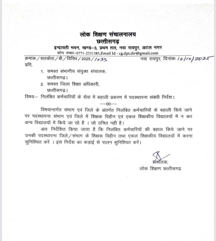 रायपुर।निलंबित कर्मचारियों की सेवा बहाली में शिक्षा अधिकारी मनमानी कर रहे. निलंबित कर्मचारियों की बहाली शिक्षक विहीन एकल शिक्षक में न करके मनचाहे स्थान दिया जा रहा है. इसे रोकने के लिए लोक शिक्षण संचालक ने सभी संभागीय संयुक्त संचालक और डीईओ को पत्र जारी किया है.जारी पत्र में कहा गया है कि संभाग एवं जिले के अंतर्गत निलंबित कर्मचारियों के बहाली किए जाने पर पदस्थापना संभाग एवं जिले में शिक्षक विहीन व एकल शिक्षकीय विद्यालयों में न कर अन्य विद्यालयों में किए जा रहे हैं, जो उचित नहीं है. निलंबित कर्मचारियों की बहाल किए जाने पर उनकी पदस्थापना जिले व संभाग के शिक्षक विहीन एवं एकल शिक्षकीय में करना सुनिश्चित करें. इस निर्देश का कड़ाई से पालन करें।