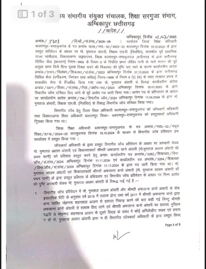 वाड्रफनगर। एक शिक्षक को पहली पत्नी को तलाक दिए बिना दूसरी शादी करना भारी पड़ गया। शिक्षक मुमताज अंसारी, जो कि शासकीय पूर्व माध्यमिक शाला चाची डाड़ में पदस्थ था। उसको पहली पत्नी की शिकायत पर बर्खास्त कर दिया गया है। प्राप्त जानकारी के अनुसार, शिक्षक की पहली पत्नी ने जिला शिक्षा अधिकारी को इस संबंध में लिखित शिकायत सौंपी थी। जांच में आरोप सही पाए गए, जिसके बाद संयुक्त संचालक सरगुजा कार्यालय ने कड़ी कार्रवाई करते हुए शिक्षक की सेवा समाप्ति का आदेश जारी किया। शिक्षक मुमताज अंसारी पर आरोप था कि उन्होंने पहली पत्नी को तलाक दिए बिना दूसरी शादी की, जो कि शासकीय सेवा नियमों और वैधानिक मर्यादाओं का उल्लंघन है। इसके पहले भी एक ऐसा ही मामला बिलासपुर के उस्लापुर से सामने आया था। जब राज्य महिला आयोग की 18वीं जनसुनवाई में अध्यक्ष किरणमयी नायक एक मामले में पत्नी के रहते दूसरी महिला के साथ रहने वाले शिक्षक को सस्पेंड करने की अनुशंसा डीईओ से की थी।उसलापुर निवासी शिक्षक ने पहली पत्नी के रहते हुए एक अन्य शादीशुदा महिला के साथ रहना शुरू कर दिया था। शिकायत मिलने पर महिला आयोग ने सुनवाई की और जिला शिक्षा अधिकारी को पत्र भेजकर शिक्षक को निलंबित करने की अनुशंसा की थी।