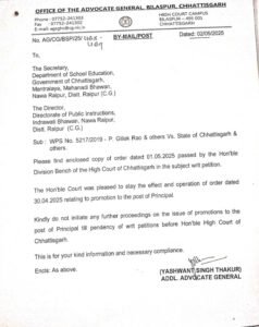 रायपुर।प्राचार्य प्रमोशन को लेकर हाईकोर्ट के कड़े रुख के बाद अब विभाग भी हरकत में आ गया है। स्कूल शिक्षा विभाग ने DPI को निर्देश जारी किया है, कि हाईकोर्ट के निर्देश के मुताबिक प्राचार्य प्रमोशन को लेकर आगे की प्रक्रिया अब नहीं बढ़ेगी। स्कूल शिक्षा विभाग की तरफ से इस संबंध में एडवोकेट जनरल के उस पत्र को भी संलग्न किया गया है, जिसमें ये स्पष्ट उल्लेख है कि प्रमोशन की प्रक्रिया फिलहाल पूरी तरह से बाधित रहेगी।