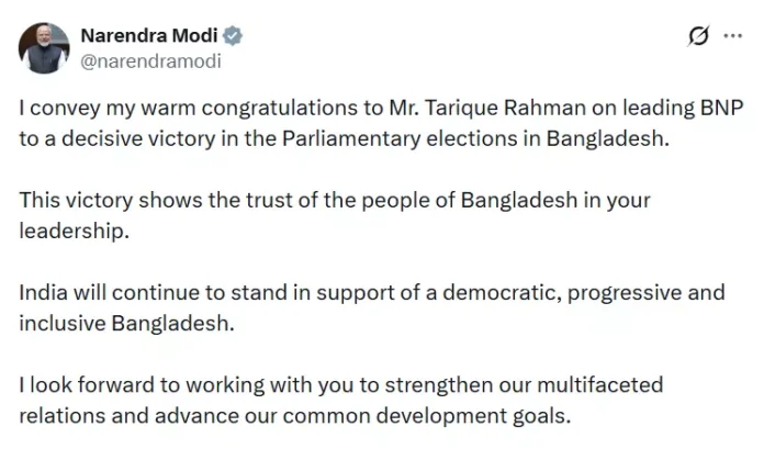 नई दिल्ली: बांग्लादेश में हुए 13वें संसदीय चुनावों में बांग्लादेश नेशनलिस्ट पार्टी (BNP) की प्रचंड जीत के बाद भारत के प्रधानमंत्री नरेंद्र मोदी ने तारिक रहमान को गर्मजोशी से बधाई दी है. पीएम मोदी ने सोशल मीडिया (X) पर साझा किए अपने संदेश में इस जीत को बांग्लादेश की जनता का उनके नेतृत्व पर अटूट विश्वास बताया. प्रधानमंत्री मोदी ने लिखा, “संसदीय चुनावों में बीएनपी को निर्णायक जीत दिलाने के लिए मैं तारिक रहमान को हार्दिक बधाई देता हूं. यह जीत आपके नेतृत्व में बांग्लादेशी लोगों के भरोसे को दर्शाती है.” उन्होंने आगे कहा कि भारत एक लोकतांत्रिक, प्रगतिशील और समावेशी बांग्लादेश के समर्थन में खड़ा रहेगा और दोनों देशों के साझा विकास लक्ष्यों को मजबूत करने के लिए मिलकर काम करने को उत्सुक है. अरेस्ट शेख हसीना के सत्ता से हटने के बाद यह बांग्लादेश में पहला बड़ा चुनाव था. 17 साल के वनवास के बाद तारिक रहमान की पार्टी की सत्ता में वापसी दक्षिण एशिया की राजनीति के लिए एक बड़ा ‘टर्निंग पॉइंट’ है. भारत ने इस बधाई संदेश के जरिए स्पष्ट संकेत दिया है कि वह नई सरकार के साथ भी मजबूत द्विपक्षीय संबंधों को प्राथमिकता देगा।