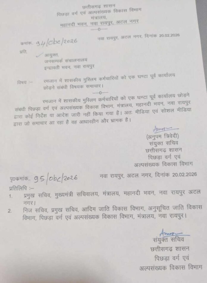 रायपुर। राज्य सरकार ने रमजान के दौरान शासकीय मुस्लिम कर्मचारियों को एक घंटा पूर्व कार्यालय छोड़ने संबंधी खबरों को निराधार बताया है। पिछड़ा वर्ग एवं अल्पसंख्यक विभाग ने स्पष्ट किया है कि इस संबंध में कोई आदेश या निर्देश जारी नहीं किया गया है।