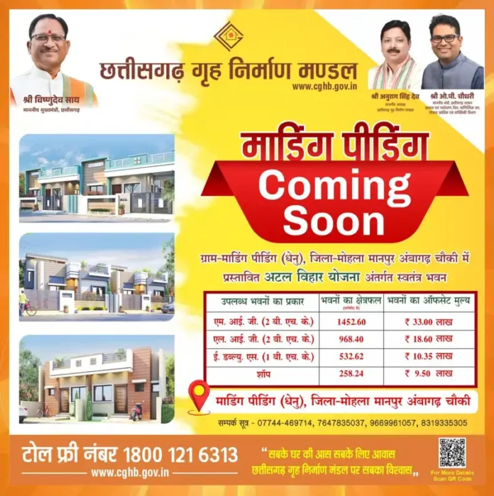 मोहला । छत्तीसगढ़ गृह निर्माण मंडल द्वारा ग्राम माडिंग पीडिंग (धेनु) जिला मोहला-मानपुर-अंबागढ़ चौकी में अटल विहार योजना अंतर्गत स्वतंत्र भवनों का निर्माण किया जाएगा। इस योजना के तहत विभिन्न श्रेणियों के आवास आम नागरिकों को किफायती दरों पर उपलब्ध कराए जाएंगे।