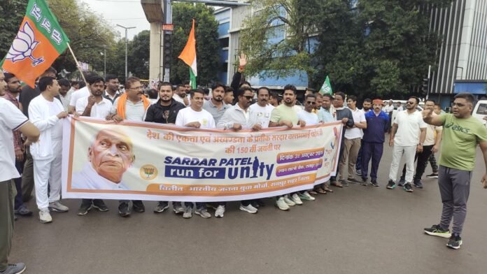 रायपुर । देश के लौह पुरुष सरदार वल्लभभाई पटेल की 150वीं जयंती पर राजधानी रायपुर में शुक्रवार को ‘रन फॉर यूनिटी’ का भव्य आयोजन किया गया। कार्यक्रम का शुभारंभ मुख्यमंत्री विष्णुदेव साय ने शास्त्री चौक से हरी झंडी दिखाकर किया। यह आयोजन भारतीय जनता पार्टी प्रदेश, जिला, युवा मोर्चा और मंडल इकाइयों की संयुक्त पहल पर किया गया, जिसमें सैकड़ों छात्र, युवा, महिला मोर्चा कार्यकर्ता और नागरिक शामिल हुए।