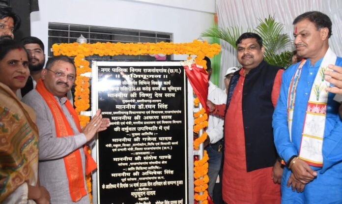 रायपुर/राजनांदगांव मुख्यमंत्री श्री विष्णु देव साय ने आज नवा रायपुर स्थित मुख्यमंत्री निवास कार्यालय से नगर पालिक निगम राजनांदगांव के विभिन्न विकास कार्यों के भूमिपूजन कार्यक्रम में वर्चुअल रूप से शामिल हुए। मुख्यमंत्री श्री विष्णु देव साय ने राजनांदगांव नगर पालिक निगम क्षेत्र में 226 करोड़ 68 लाख रूपए से अधिक की लागत से होने वाले विभिन्न विकास कार्यों का भूमिपूजन किया। इस अवसर पर विधानसभा अध्यक्ष डॉ. रमन सिंह विधानसभा निवास कार्यालय रायपुर से वर्चुवल माध्यम से कार्यक्रम में शामिल हुए। स्कूल शिक्षा एवं जिले के प्रभारी मंत्री श्री गजेन्द्र यादव, सांसद श्री संतोष पाण्डेय, महापौर श्री मधुसूदन यादव एवं अन्य जनप्रतिनिधि पुष्पवाटिका योगा हॉल राजनांदगांव में आयोजित भूमिपूजन कार्यक्रम में सम्मिलित हुए।