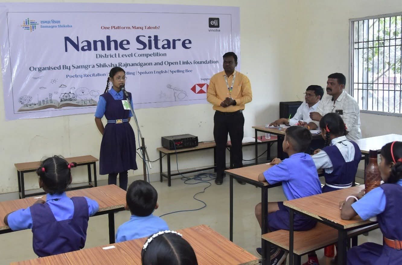स्पेलिंग बी प्रतियोगिता (कक्षा 4 से 5 एवं 6 से में रतिश देवांगन एवं तानिया देवांगन प्रथम, ईशानी बागड़े एवं ऋद्धि साहू द्वितीय तथा देवाशीष प्रधान एवं नेमिका साहू तृतीय स्थान पर रहे। कार्यक्रम का संचालन प्रोग्राम मैनेजर तुषार साहू एवं प्रोजेक्ट ऑफिसर नरेंद्र साहू द्वारा किया गया। छत्तीसगढ़ की संपूर्ण टीम ने आयोजन की सफलता में महत्वपूर्ण योगदान दिया। नन्हे सितारे प्रतियोगिता का आयोजन वर्तमान में राजनांदगांव जिले में संचालित आचार्य विनोबा भावे शिक्षक सहयोग कार्यक्रम के अंतर्गत किया गया। इस कार्यक्रम का मुख्य उद्देश्य आधुनिक तकनीक के माध्यम से शिक्षकों को सशक्त बनाना एवं नवाचार आधारित शिक्षण पद्धतियों को बढ़ावा देना है। राजनांदगांव जिले के सभी विकासखंडों के 1336 शासकीय विद्यालयों में विनोबा कार्यक्रम सक्रिय है, जिसके माध्यम से 5536 शिक्षक और लगभग 1,30,000 विद्यार्थी विभिन्न शैक्षणिक पहलों जैसे जेएनवी एवं एनएमएमएसई अभ्यास परीक्षण, पोलस्टार कार्यक्रम तथा क्लब गतिविधियों से लाभान्वित हो रहे हैं।