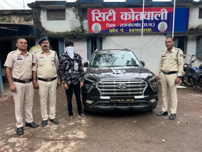 थाना प्रभारी निरीक्षक नंदकिशोर गौतम के नेतृत्व में पोस्ट ऑफिस चौक ओवर ब्रिज के नीचे सट्टा संचालन की सूचना पर दबिश दी गई, जहां आरोपी अनुप यादव उर्फ मुंडु पिता राजेश यादव (उम्र 29 वर्ष), निवासी बलदेव बाग, राजनांदगांव को रंगेहाथ पकड़ा गया। आरोपी अपनी काली रंग की क्रेटा कार (CG 08 AU 1672) में बैठकर मोबाइल के माध्यम से अंकों पर रुपये-पैसों का दांव लगवा रहा था और व्हाट्सएप पर सट्टा पर्ची तैयार कर रहा था पुलिस ने मौके से आरोपी के कब्जे से क्रेटा कार (कीमत ₹12 लाख), नगद ₹4,000, सट्टा पर्ची की छाया प्रति 08, रेडमी और वीवो कंपनी के दो मोबाइल फोन (कीमत ₹70,000) सहित कुल ₹12,74,000 की संपत्ति जप्त की।