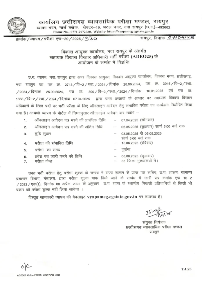 रायपुर।छत्तीसगढ़ व्यवसायिक परीक्षा मंडल ने एक बार फिर से युवाओं के लिए सुनहरा अवसर प्रदान किया है। सहायक विकास विस्तार अधिकारी के रिक्त पदों पर भर्ती प्रक्रिया के लिए ऑनलाइन आवेदन आमंत्रित किए गए हैं।