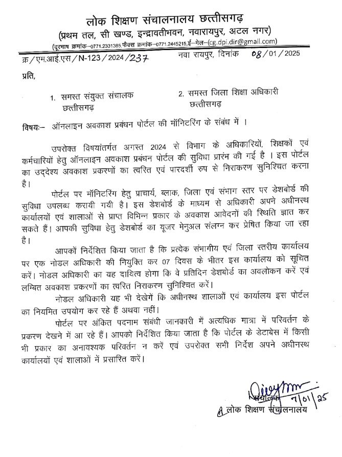 डीपीआई ने सभी जेपी और डीईओ को निर्देश दिया है कि अवकाश प्रकरण का त्वरित और पारदर्शी तरीके से क्रियान्वयन हो। अवकाश पोर्टल कोलेकर डीपीआई ने संभाग और जिलास्तर पर नोडल अफसर की नियुक्ति का निर्देश दिया है। 7 दिन के भीतर नोडल अफसर नियुक्ति कर जानकारी मांगी गयी है।