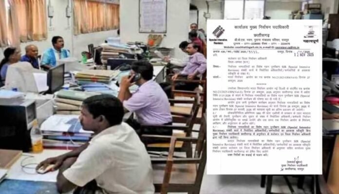 रायपुर। भारत निर्वाचन आयोग के आदेश के मद्देनजर छत्तीसगढ़ में SIR (Special Intensive Revision) विशेष गहन पुनरीक्षण का कार्य प्रारंभ हो गया है। एसआईआर में जिन शिक्षकों, अधिकारी व कर्मचारियों की ड्यूटी लगाई गई है उनकी छुट्टियां कैंसिल कर दी गई है। आयोग की अनुमति के बगैर इनको अवकाश नहीं मिलेगा। राज्य निर्वाचन आयोग ने प्रदेशभर के कलेक्टर्स को पत्र लिखकर आदेश के परिपालन के संबंध में दिशा निर्देश जारी किया है। आदेश के बाद भी बिना अनुमति अवकाश पर जाने वाले अधिकारी व कर्मचारियों के खिलाफ कार्रवाई की चेतावनी आयोग ने दी है।