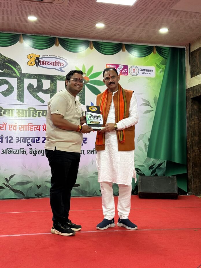 भिलाई ।बैकुंठपुर जिला कोरिया में आयोजित दो दिवसीय साहित्य महोत्सव कोसम में सरस्वती बुक्स को कोसम सम्मान प्रदान किया गया. यह सम्मान छत्तीसगढ़ और छत्तीसगढ़ी साहित्य प्रकाशन के क्षेत्र में उल्लेखनीय प्रकाशन हेतु छत्तीसगढ़ शासन के स्वास्थ्य मंत्री श्याम बिहारी जायसवाल के हाथों प्रदान किया गया. यह सम्मान सरस्वती बुक्स के युवा प्रकाशक आकाश महेश्वरी ने ग्रहण किया. इस अवसर पर आकाश महेश्वरी ने कहा है कि सम्मान के मिलने से जिम्मेदारियां और बढ़ गई हैं।
