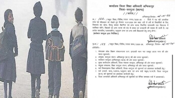 सरगुजा के जिला शिक्षा अधिकारी की तरफ से जारी आदेशके मुताबिक सरगुजा जिले में पड़ रही अत्यधिक ठंड और शीतलहर को देखते हुए 10 जनवरी तक पहली से पांचवीं तक के विद्यार्थियों के लिए स्कूल बंद रहेगा। लेकिन, सभी शिक्षक और कर्मचारी को निर्धारित समय में स्कूल आना होगा। शिक्षा विभाग की तरफ से जारी आदेश में शिक्षकों और कर्मचारियों को भी ठंड से बचाव और सावधानी बरतने की हिदायत दी गयी है।