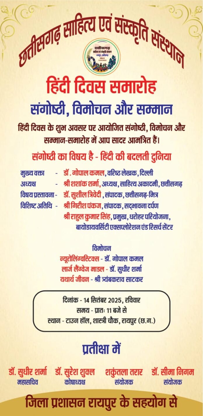 रायपुर। छत्तीसगढ़ साहित्य एवं संस्कृति संस्थान के तत्वावधान में जिला प्रशासन रायपुर के सहयोग से हिंदी उत्सव का आयोजन हिंदी दिवस पर किया गया है। टाऊन हॉल में आयोजित इस समारोह में हिंदी की बदलती दुनिया पर संगोष्ठी, विमोचन और हिंदी समाचार वाचकों का सम्मान किया जाएगा।
