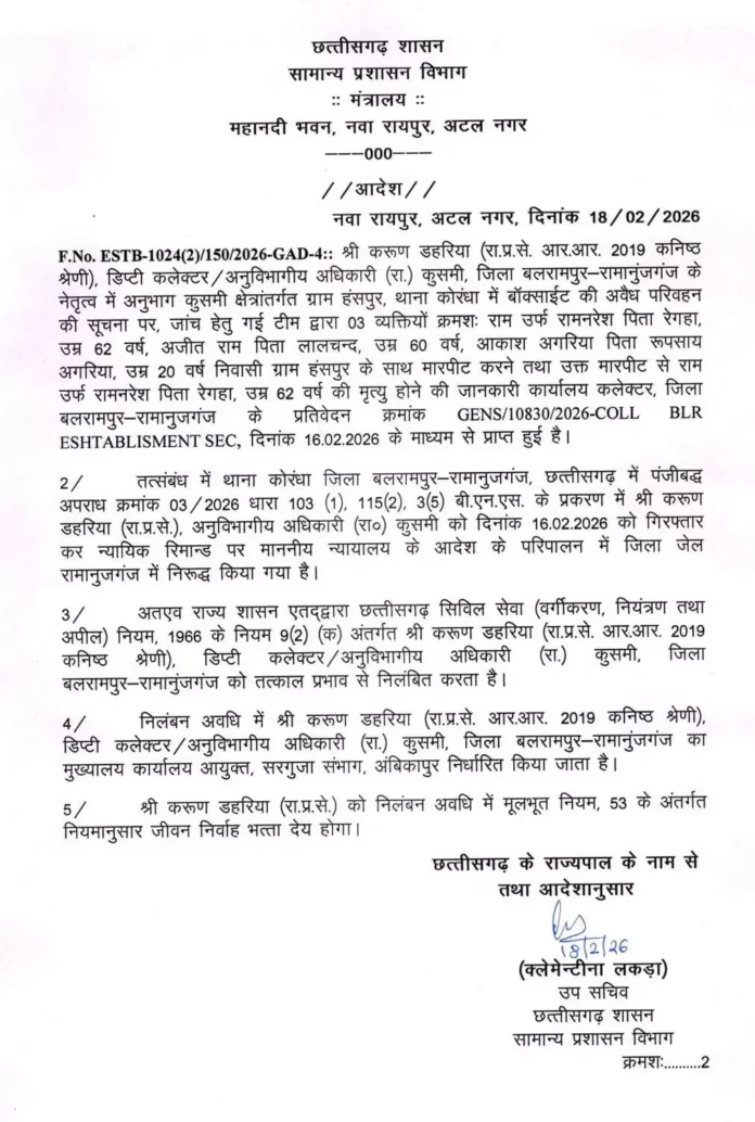 रायपुर। ग्रामीण की मौत मामले में आरोपी SDM करुण डहरिया को साय सरकार ने सस्पेंड कर दिया है। निलंबन आदेश में लिखा है कि करूण डहरिया ( रा.प्र.से. आर. आर. 2019 कनिष्ठ श्रेणी), डिप्टी कलेक्टर/ अनुविभागीय अधिकारी (रा.) कुसमी, जिला बलरामपुर-रामानुजगंज के नेतृत्व में अनुभाग कुसमी क्षेत्रांतर्गत ग्राम हंसपुर, थाना कोरंधा में बॉक्साईट की अवैध परिवहन की सूचना पर जांच हेतु गई टीम द्वारा 03 व्यक्तियों क्रमशः राम उर्फ रामनरेश पिता रेगहा, उम्र 62 वर्ष, अजीत राम पिता लालचन्द, उम्र 60 वर्ष, आकाश अगरिया पिता रूपसाय अगरिया, उम्र 20 वर्ष निवासी ग्राम हंसपुर के साथ मारपीट करने तथा उक्त मारपीट से राम उर्फ रामनरेश पिता रेगहा, उम्र 62 वर्ष की मृत्यु होने की जानकारी कार्यालय कलेक्टर, जिला के प्रतिवेदन क्रमांक GENS/10830/2026-COLL बलरामपुर-रामानुजगंज ESHTABLISMENT SEC, दिनांक 16.02.2026 के माध्यम से प्राप्त हुई है। तत्संबंध में थाना कोरंधा जिला बलरामपुर-रामानुजगंज, छत्तीसगढ़ में पंजीबद्ध अपराध क्रमांक 03/ 2026 धारा 103 (1), 115 (2), 3 ( 5 ) बी.एन.एस. के प्रकरण में श्री करूण डहरिया ( रा.प्र.से.), अनुविभागीय अधिकारी ( रा० ) कुसमी को दिनांक 16.02.2026 को गिरफ्तार कर न्यायिक रिमान्ड पर माननीय न्यायालय के आदेश के परिपालन में जिला जेल रामानुजगंज में निरूद्ध किया गया है। अतएव राज्य शासन एतद्द्वारा छत्तीसगढ़ सिविल सेवा (वर्गीकरण, नियंत्रण तथा अपील) नियम, 1966 के नियम 9 (2) (क) अंतर्गत करूण डहरिया ( रा.प्र.से. आर. आर. 2019 कनिष्ठ श्रेणी), डिप्टी कलेक्टर / अनुविभागीय अधिकारी (रा.) कुसमी, जिला बलरामपुर-रामानुजगंज को तत्काल प्रभाव से निलंबित करता है। निलंबन अवधि में करूण डहरिया ( रा.प्र.से. आर. आर. 2019 कनिष्ठ श्रेणी), डिप्टी कलेक्टर/अनुविभागीय अधिकारी (रा.) कुसमी, जिला बलरामपुर-रामानुजगंज का मुख्यालय कार्यालय आयुक्त, सरगुजा संभाग, अंबिकापुर निर्धारित किया जाता है। करूण डहरिया ( रा.प्र.से.) को निलंबन अवधि में मूलभूत नियम, 53 के अंतर्गत नियमानुसार जीवन निर्वाह भत्ता देय होगा।