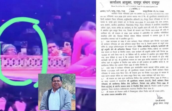 रायपुर। छत्तीसगढ़ के गरियाबंद जिले में आयोजित अश्लील नृत्य कार्यक्रम को लेकर प्रशासन ने बड़ी कार्रवाई की है. डिप्टी कलेक्टर SDM तुलसीदास मरकाम को तत्काल प्रभाव से निलंबित कर दिया गया है. यह कार्रवाई 5 से 10 जनवरी 2026 के बीच आयोजित तथाकथित ओपेरा कार्यक्रम में अश्लील नृत्य की अनुमति देने और कर्तव्य में गंभीर लापरवाही के आरोपों के बाद की गई है.